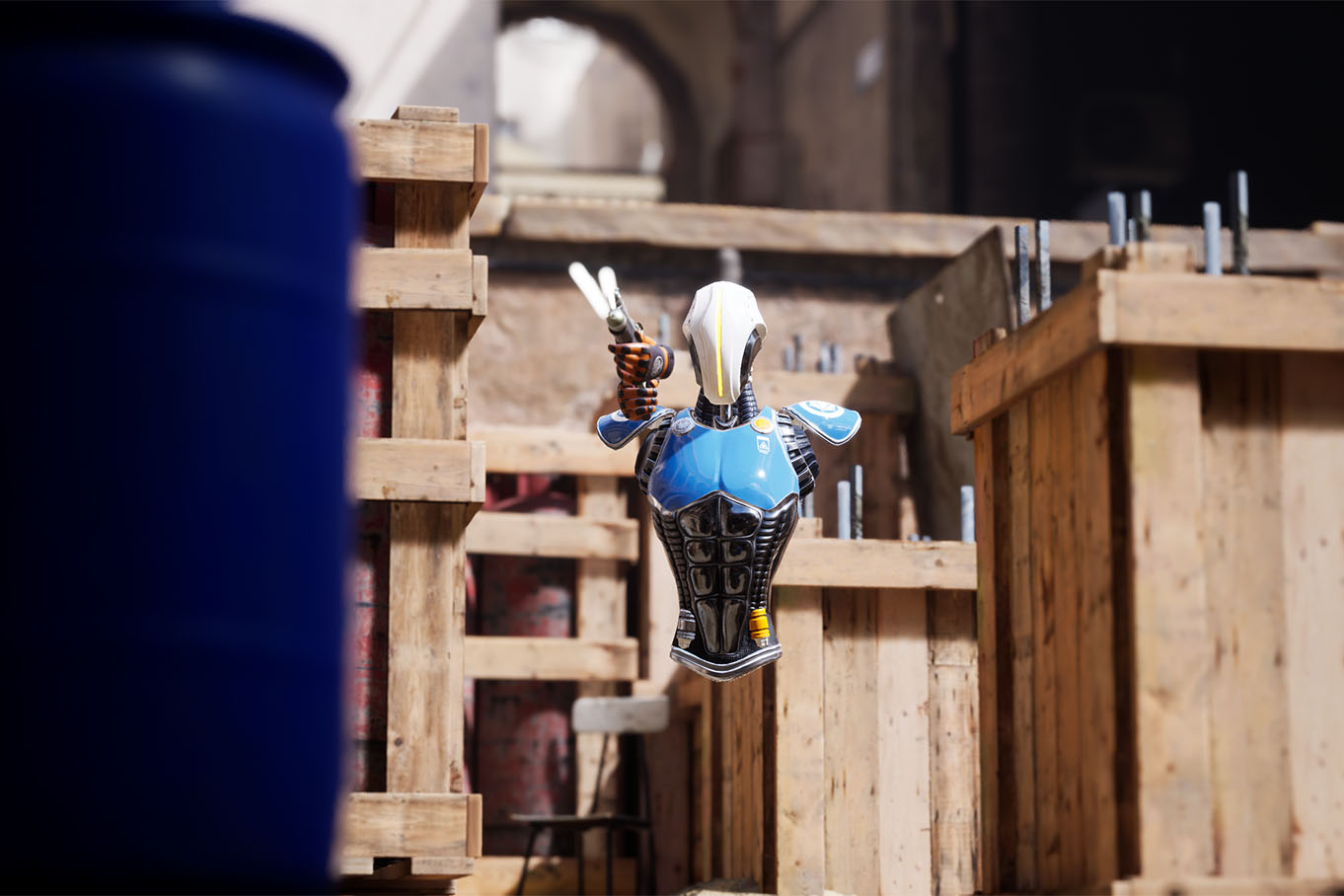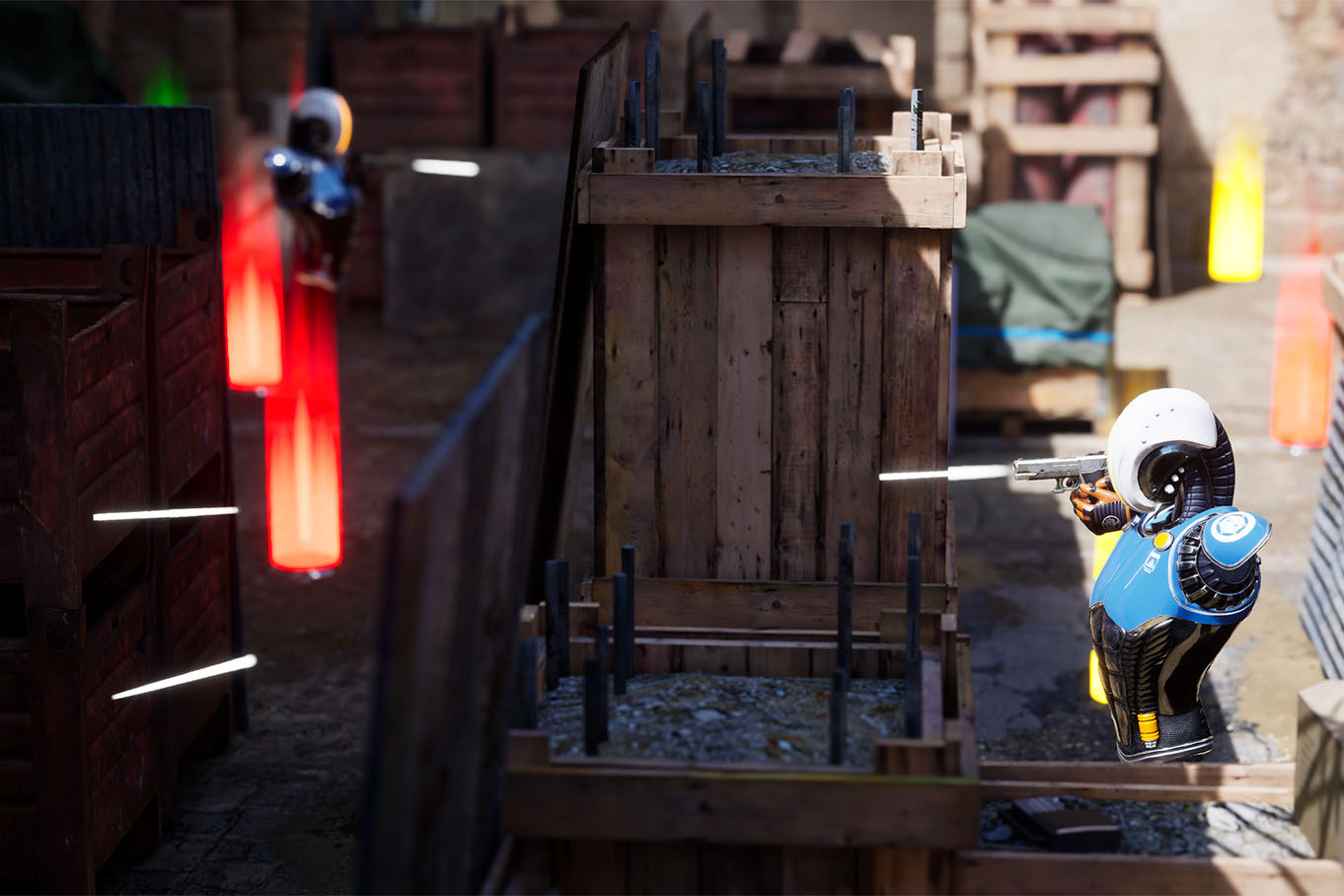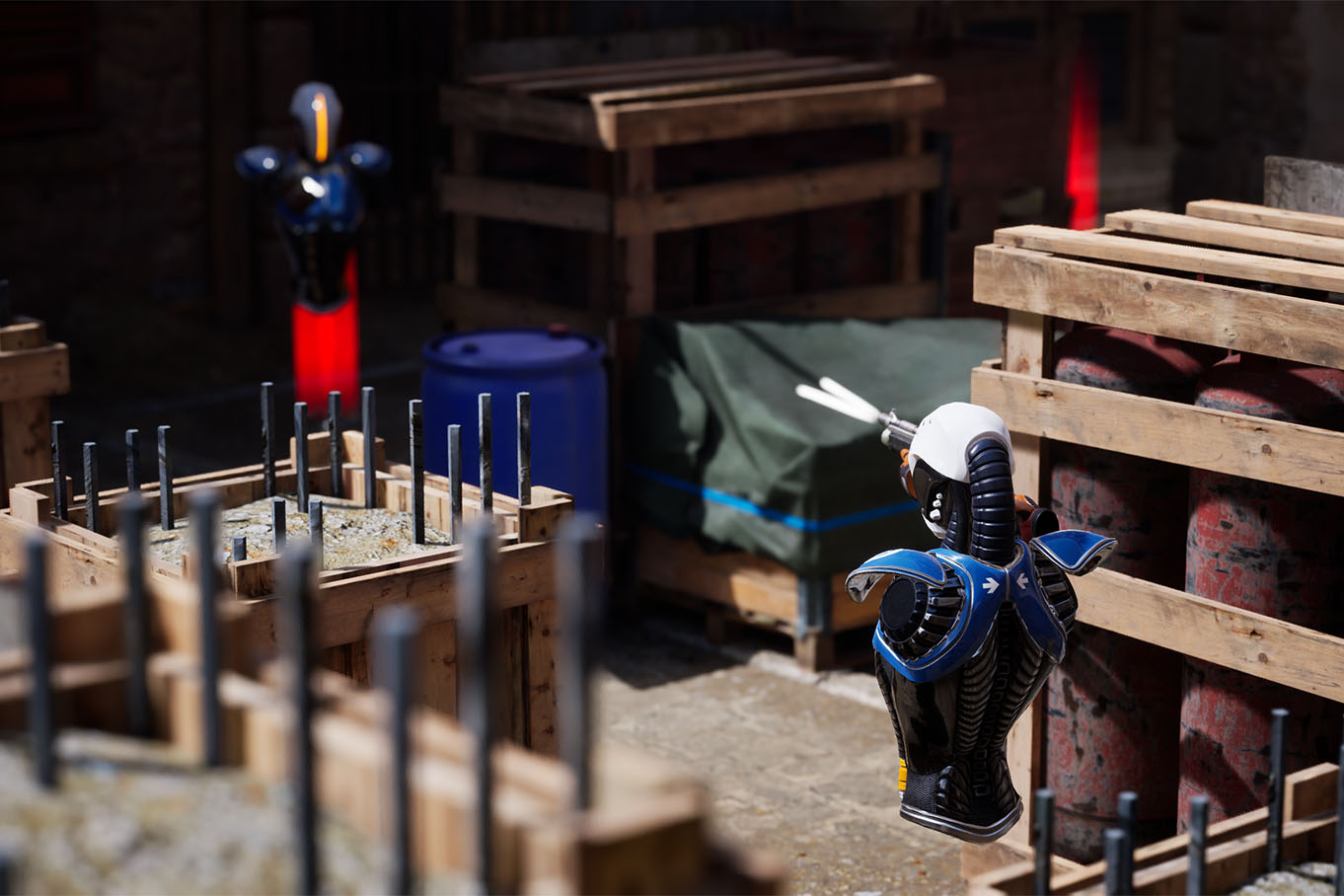 L’équipement mis en place permet de se déplacer librement sur une surface de 450 m², sans ordinateur embarqué sur le dos. Vous êtes uniquement muni de votre casque de réalité virtuelle et de votre arme.